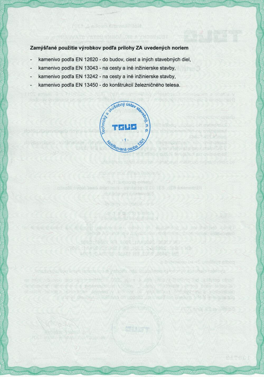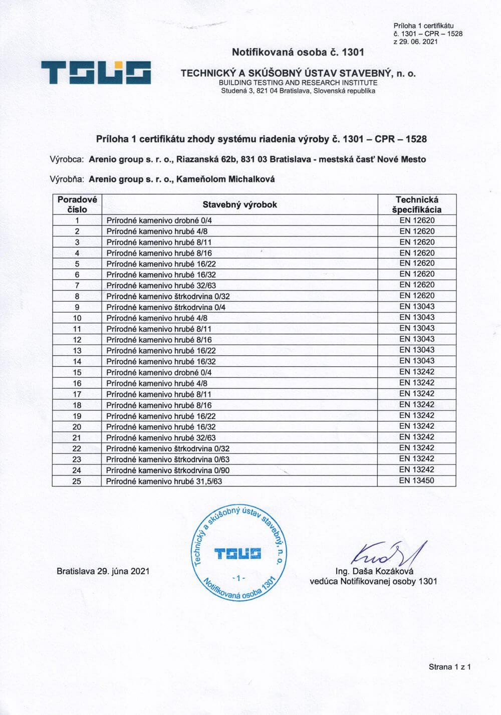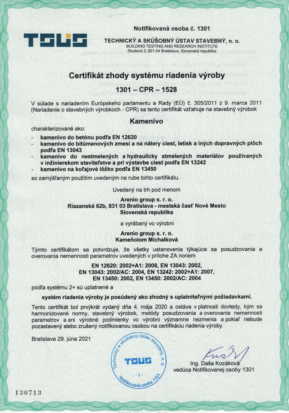 Certifikát zhody systému riadenia výroby 1301-CPR-1528 vydaný TSÚS, n.o., Studená 3, 821 04 Bratislava